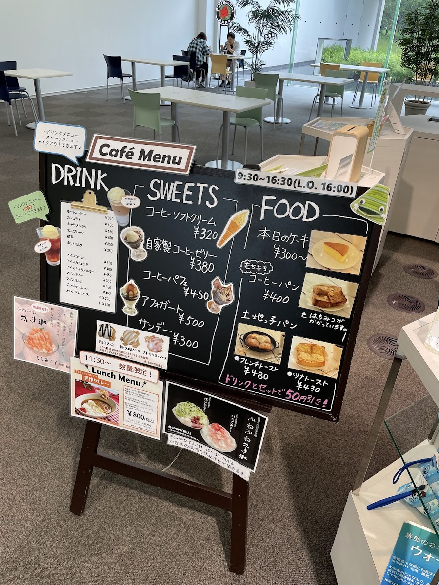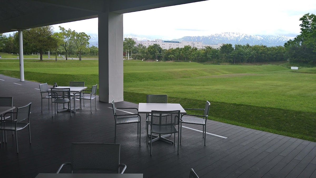 As you enter, the expansive interior—complete with airy terrace seating—invites you to linger. Surrounded by the greenery of well-manicured lawns and the stunning backdrop of the Northern Alps, the café’s ambiance radiates tranquility and comfort, making it an ideal spot for both solitary reflections and casual meet-ups with friends.